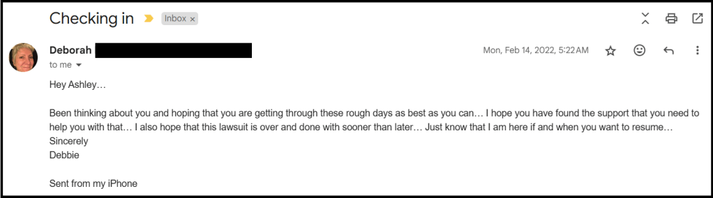 I underestimated the impact this would have on me. I thought I had no sense of privacy at that point already from the discovery process of the lawsuit. I wasn’t happy about sharing the file, but the alternative wouldn’t work for me either.