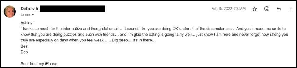 Finding a therapist took more effort than I wish it would have, but I was determined. And I got really lucky this time, because my therapist was really a perfect match for me. She was an age that she could be my mom, and she had a nurturing, motherly energy with me, but she was cool and like-minded, had tattoos and was very into meditation and mindfulness. I know it can be really hard to find the right match and then for the right match to have availability and accept your insurance. I don’t believe in karma, but if I did, I would say that Deb was the counteranswer to the nurse practitioner I had encountered all those years ago.