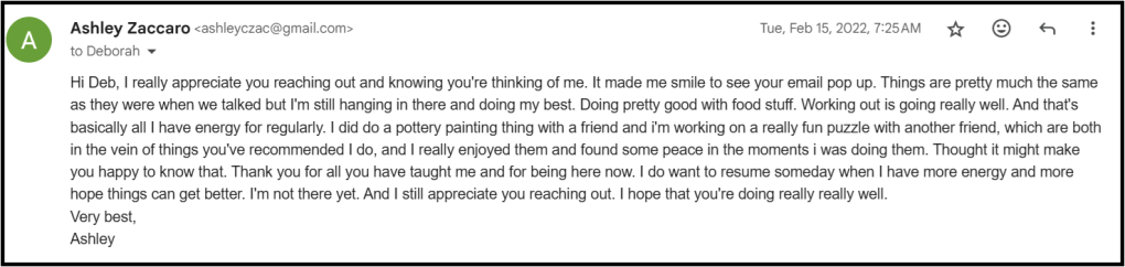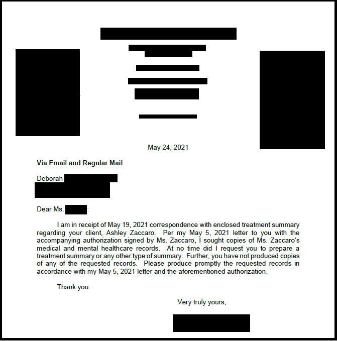 But we tried, first, to provide them with a summary of what was relevant rather than the entire file itself. My therapist gave them this: